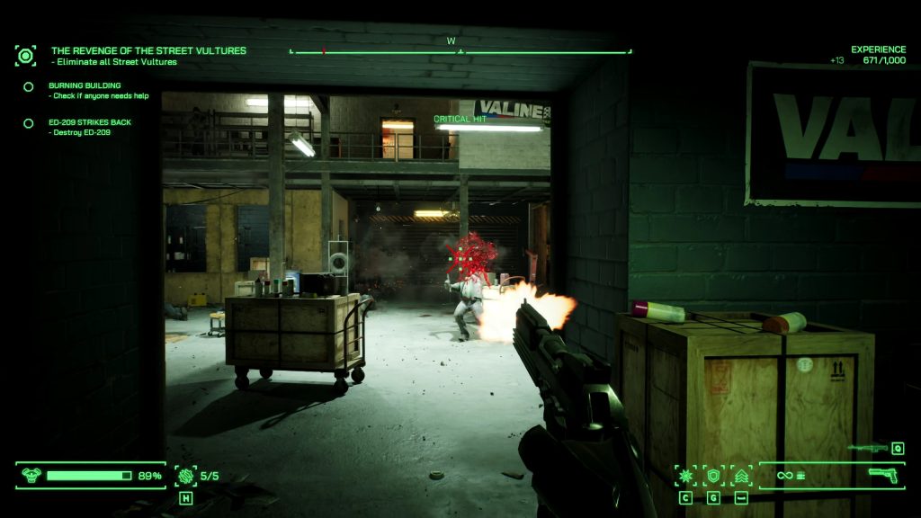 Robocop: Rogue City is an FPS with light RPG elements. I am aware that generally the term for such a game is usually ‘immersive Sim’ but in this case I don’t think this game fits into the immersive sim genre. You see, in an immersive sim you are usually given multiple ways to approach a situation. You can gear up for a stealthy approach, maybe go in guns blazing, talk your way through… that kind of thing. That’s simply not the case here, when playing Robocop you basically have two modes, combat and investigation and those modes are transitioned between automatically. There is no stealth element here, and to be honest, Robocop is not built for stealth at all. When you encounter enemies you enter into combat mode and Robocop pulls out his gun otherwise all your abilities and weapons stay stowed. When out and about patrolling the streets or when in the precinct you’re in investigation mode. In this mode you use Robocops ‘Robovision’ to highlight clues, footprints and basically anything marked with a question mark.