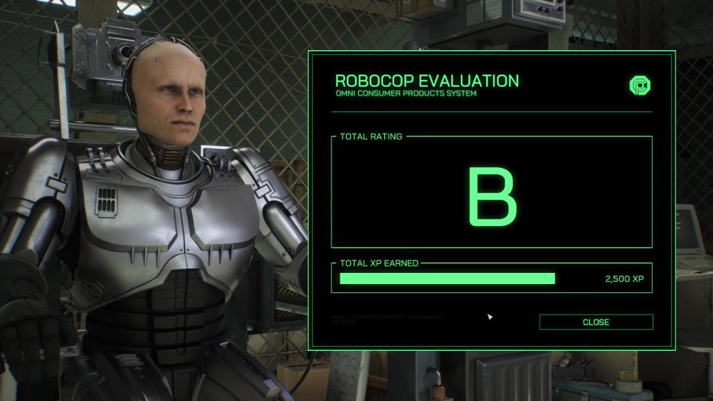 The evaluations that Robocop undergoes are both a part of the overall plot but also act as a grading system showing you what you did and did not accomplish. At the end you’re given your grade and whatever XP the various objectives you completed are worth.