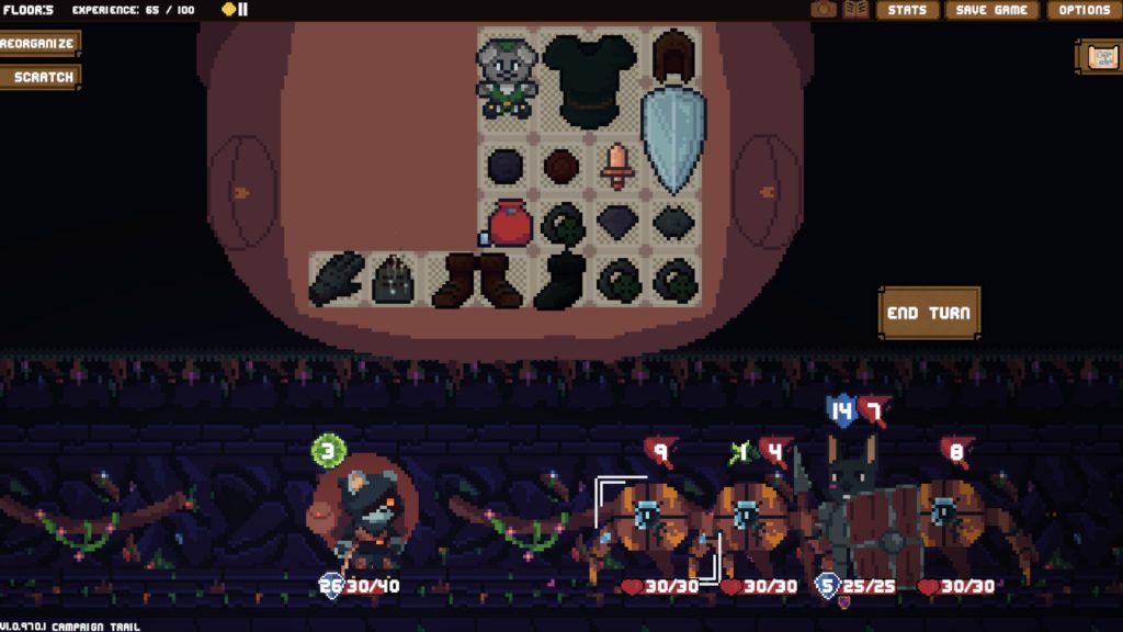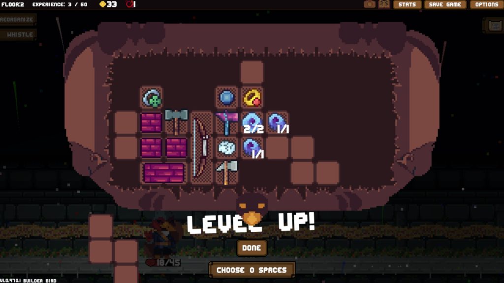 Levelling up allows you to add more spaces to your inventory, depending on which character you are playing as at the time this may work slightly differently. For example when, Purse (the default character) levels up you select three spaces that are contiguous to your existing inventory. However, when Satchel levels up he gets to choose between two shapes that can be added to the existing space or can create a separate ‘pocket’. Something to note is that all your levels are removed upon ending a delve causing you to start afresh each time you try again.