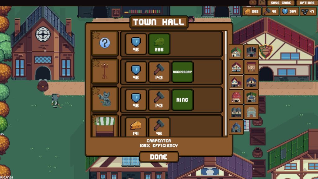 Upon completion of a delve into the dungeon you return to your home village of Haversack Hill, it’s seen better days, but through your adventuring you can improve it by constructing new buildings.