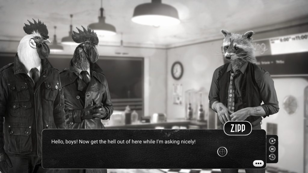 Film Noir is not a theme that I often see used within the video game space. Chicken Police really leans into the genre, using all the trappings that you would expect, such as the femme fatale and the cynical detective. Of course, one of the major things that makes this game stand out is that all the people in this game are some sort of animal, or rather an animal’s head attached to a human body. This isn’t just some random change made to make the game quirky, the fact that each person is a different animal plays into the very narrative and world building. Think Zootopia except they decide to make it for an adult audience. Yes, that’s right there are sexual themes (no actual sex just risque imagery) and murder.
