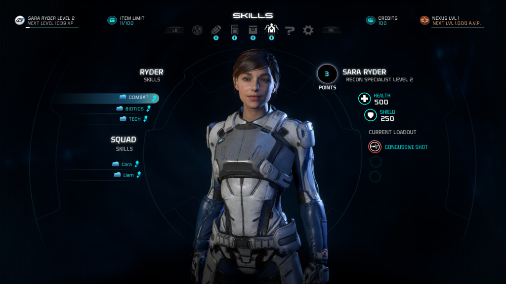 Ryder has a cybernetic neural implant that allows them to swap between ‘profiles’ thanks to an AI called SAM (Simulated Adaptive Matrix). These profiles are what replace the class system, instead of picking a single class and sticking with it Ryder can swap between them on the fly. Each of these profiles confers a passive bonus while active such as increasing weapon damage etc. There are a total of seven profiles (one for each class plus a new one called explorer) that can be loaded, however you can only have one profile active at a time and there are thresholds that must be met in order to unlock some. These thresholds are the number of skill points you invest in a specific skill group. For example, to unlock the Sentinel profile you need to spend three points each in biotic and tech skills. These profiles also have ranks that are achieved by spending more skill points in the related skill groups. Increasing the ranks of a skill increases the passive benefits that the profile comes with.